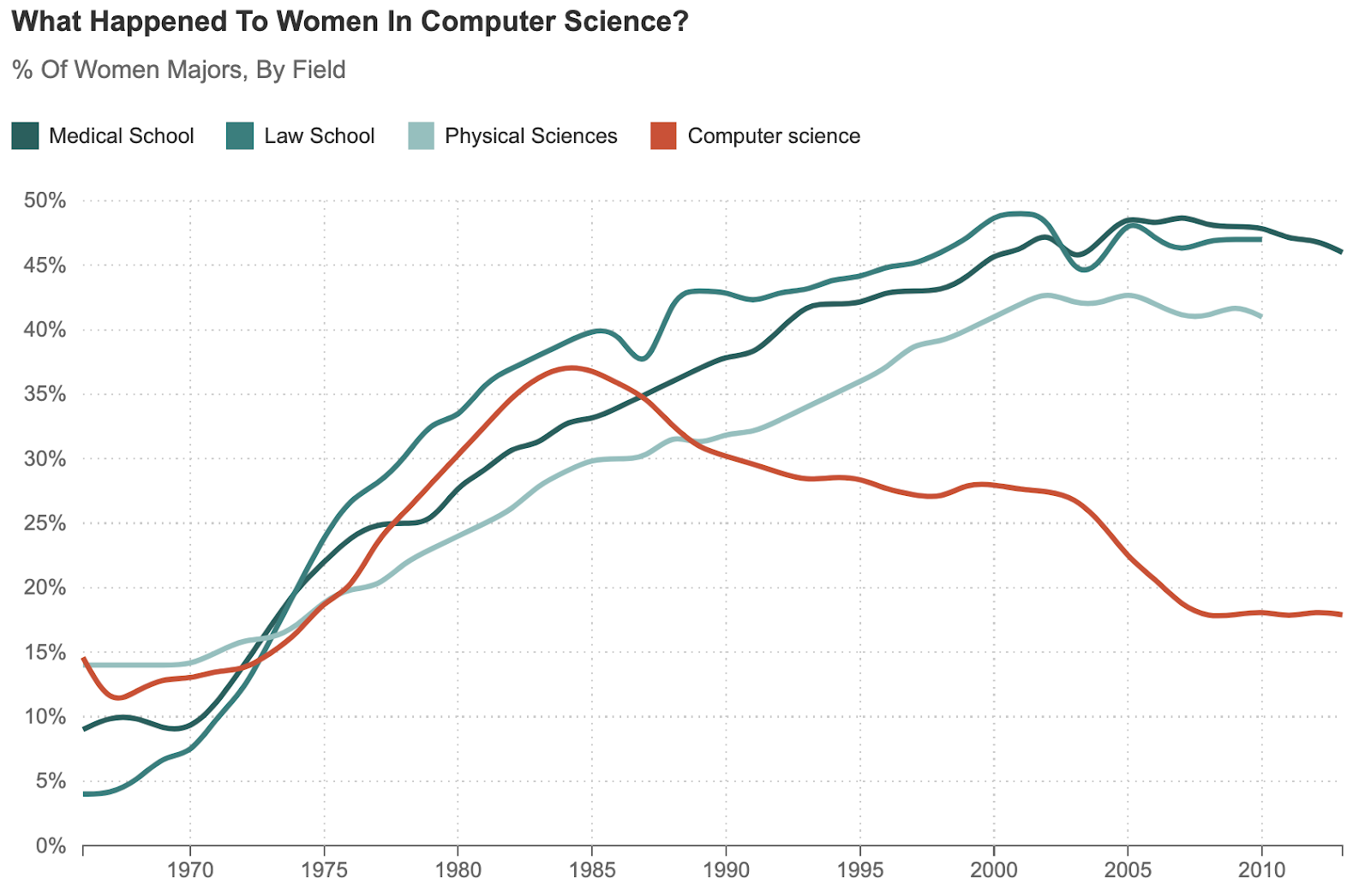 But after 1984, around the same time personal computers became a thing, the numbers of women in tech started dropping drastically and so far haven’t recovered. One of the main reasons is that personal computers were marketed as ‘toys for boys’. Since gender roles and stereotypes were already fairly strong in society, the push from the marketing and entertainment industry just emphasized that narrative.